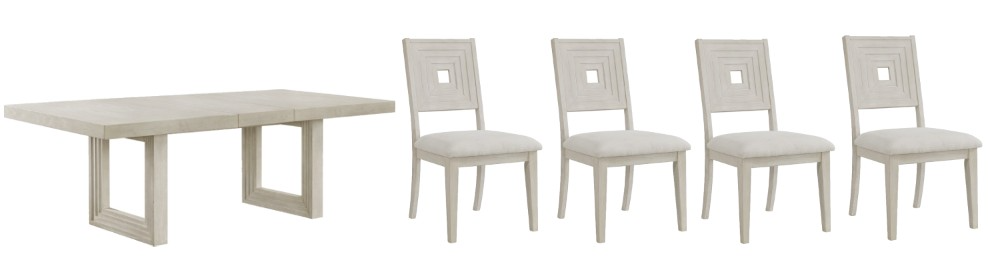 Introducing the Avalanche 5 piece Dining Set, where elegance meets practicality. Featuring an 18" leaf, extending from 74" to 92", it accommodates gatherings of any size with ease. Adorned with raised geometric patterns and finished in antique white, this set exudes modern sophistication.Read More