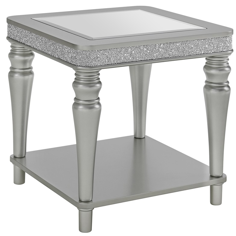 Accent your living space with the glamourous style of the Avril End Table. Accented with a mirror plate, the tabletop’s spacious surface is complemented by an equally broad open shelf, extending your storage and display options. Stylized legs provide a durable foundation, while the glitter trim adorning the table’s perimeter elevates its visual appeal.Read More
