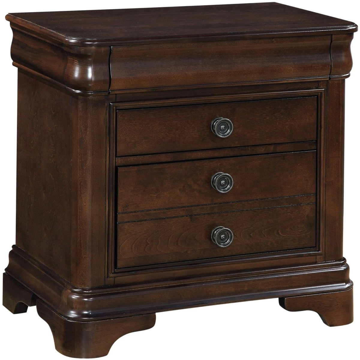 This bedside staple comes with two, spacious drawers, perfect for keeping all of your bedside necessities within reach. Dark pewter finish drawer knobs complement the warm, cherry finish beautifully. Bevel edges and bracket feet complete the look of this transitional design.