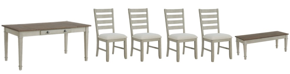 Bring farmhouse charm and functionality to your dining room with the Farmington 6-Piece Dining Set. This group includes a table, four chairs, and a storage bench, all in a beautiful two-tone design of medium brown and washed stone.Read More