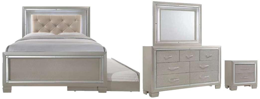 The Platinum youth twin platform 4-piece bedroom set is sure to delight your glamour queen. The mirror glass trim is consistent throughout the collection while the tufted headboard and chic champagne finish complement this group.Read More