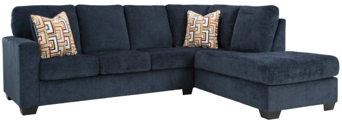 Liven up your living room with this sectional with a chaise. Its trend-right navy blue upholstery adds a playful pop of color to your decor. Bold and eclectic accent pillows complete the look. Pairing posh style with everyday comfort, the sectional is a welcome addition to contemporary spaces.Read More