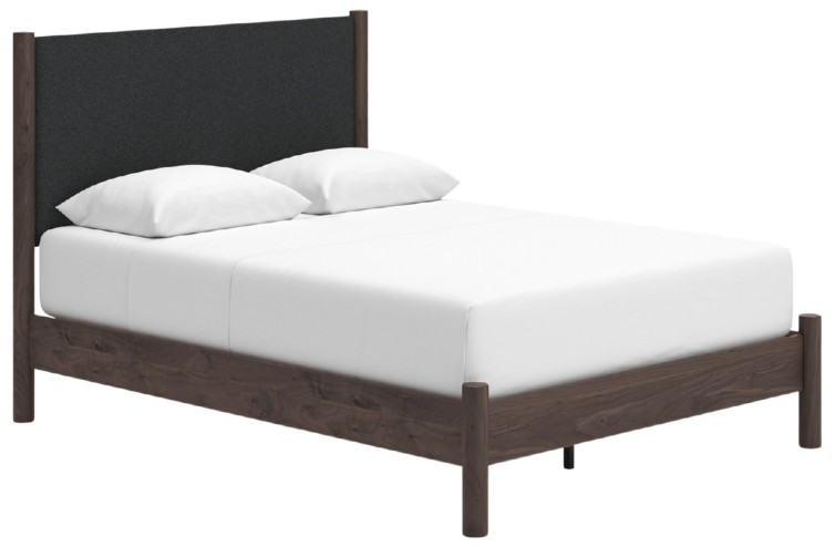 Includes upholstered panel headboard, platform footboard with rails and roll slats